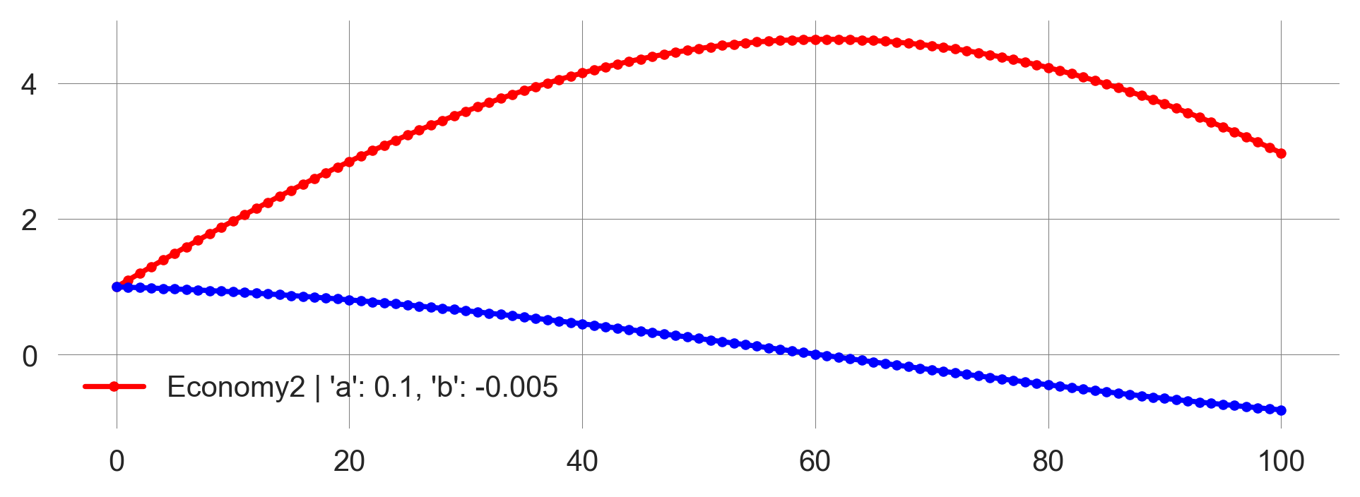 This means the value of the stock \(x\) at time \(t+1\) equals the value of the function \(F\), which depends on the value of stock at time \(t\). Note that another common name for dynamic systems in discrete time is maps.