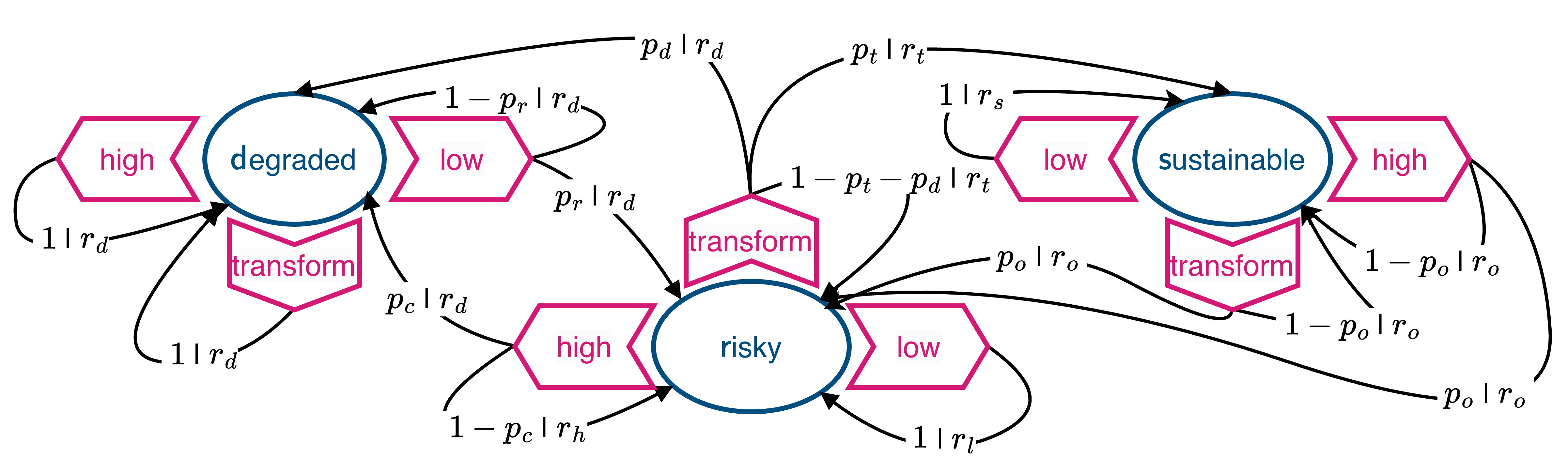 An alternative to the cautious low-intensity action at the risky state is the transformation action, where eventually high levels of sustainable wellbeing \(r_s > r_h\) can be achieved (after the transition to the sustainable state with transition probability \(p_t\)).