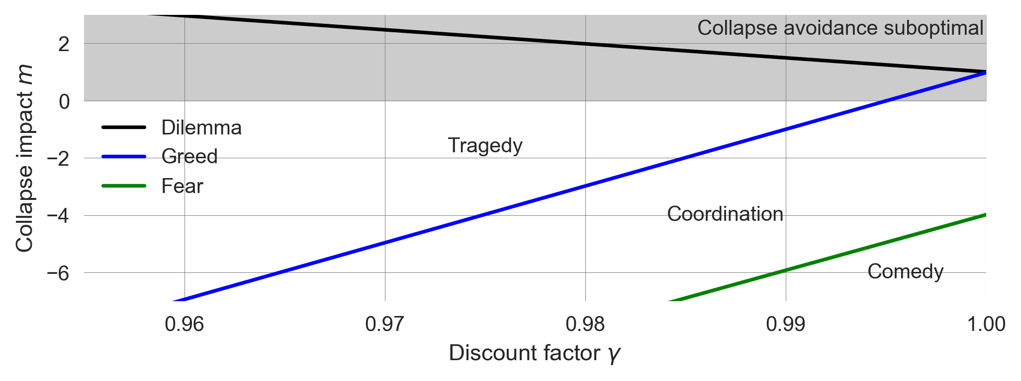 plt.xlabel('Discount factor $\\gamma$'); plt.ylabel('Collapse impact $m$');plot_collective_action_regimes()