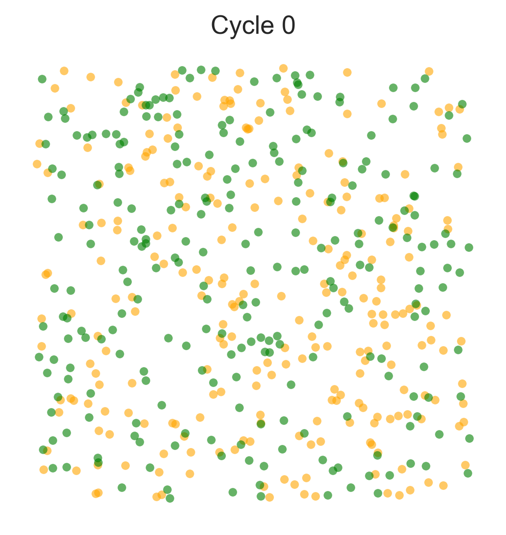 The second example model studies the phenomenon of racially segregated neighborhoods. The content here is heavily inspired by QuantEcon’s Quantitative Economics with Python.